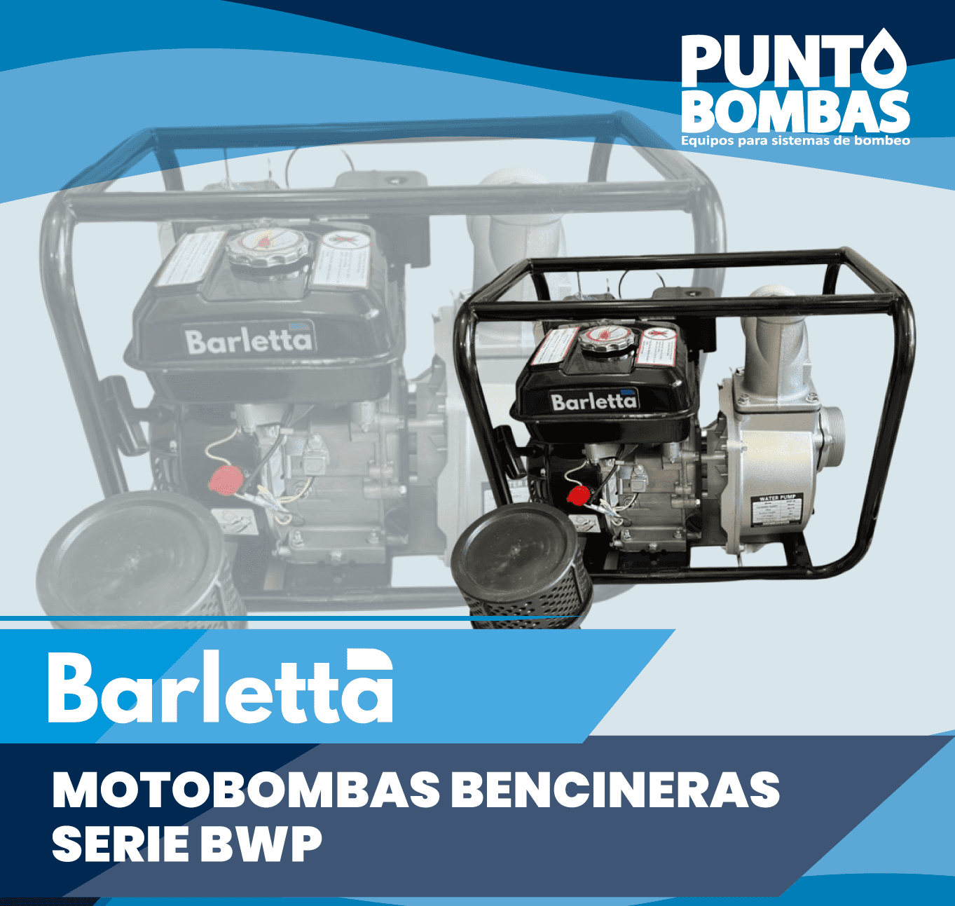 Motobombas bencineras Barletta serie BWP, montada en un armazón de jaula completa, además de montura de resorte, copla de succión y descarga. Usos Sugeridos sistemas de riego, desagüe de tanques de poca profundidad, drenaje de piscinas o achique de aguas servidas, entre otros.
